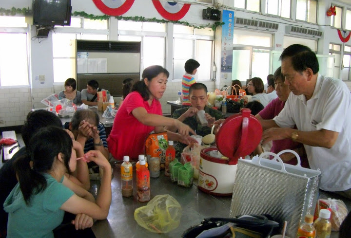 餐廳內外,走廊,樹蔭下都擠滿了人, 都和我們一樣,帶了好多吃不說,